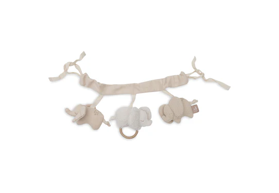 Cette joyeuse attache-poussette est ornée de trois éléphants adorables, chacun avec un design unique : un éléphant en velours blanc, un en tissu côtelé et un uni avec des oreilles à carreaux. Les éléphants sont reliés et faciles à fixer à la poussette. Parfait pour les balades !