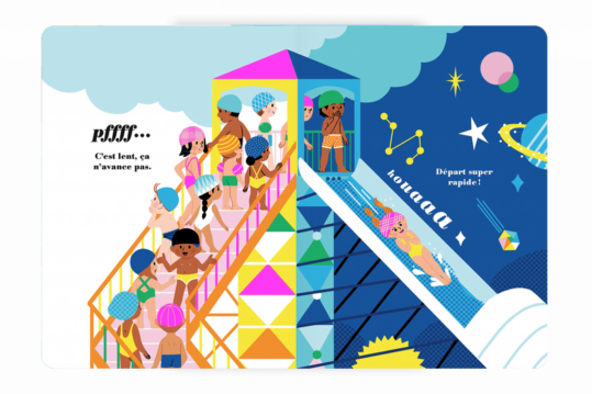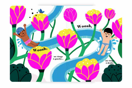 Un très joli livre cartonné, pop et acidulé, qui aborde les contraires de façon ludique grâce au toboggan aquatique le plus fou qu’on puisse imaginer!