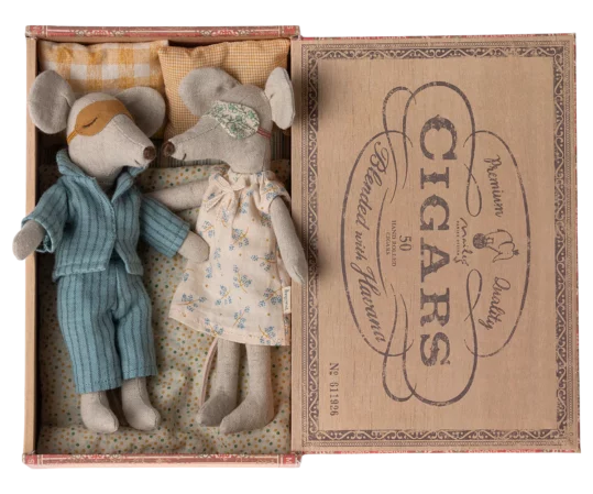 Un classique de Maileg. Papa et maman souris portent leurs magnifiques vêtements et masques de nuit. La boîte à cigares est un lit parfait pour une bonne nuit de sommeil et de beaux rêves. La couleur du linge de lit peut varier.