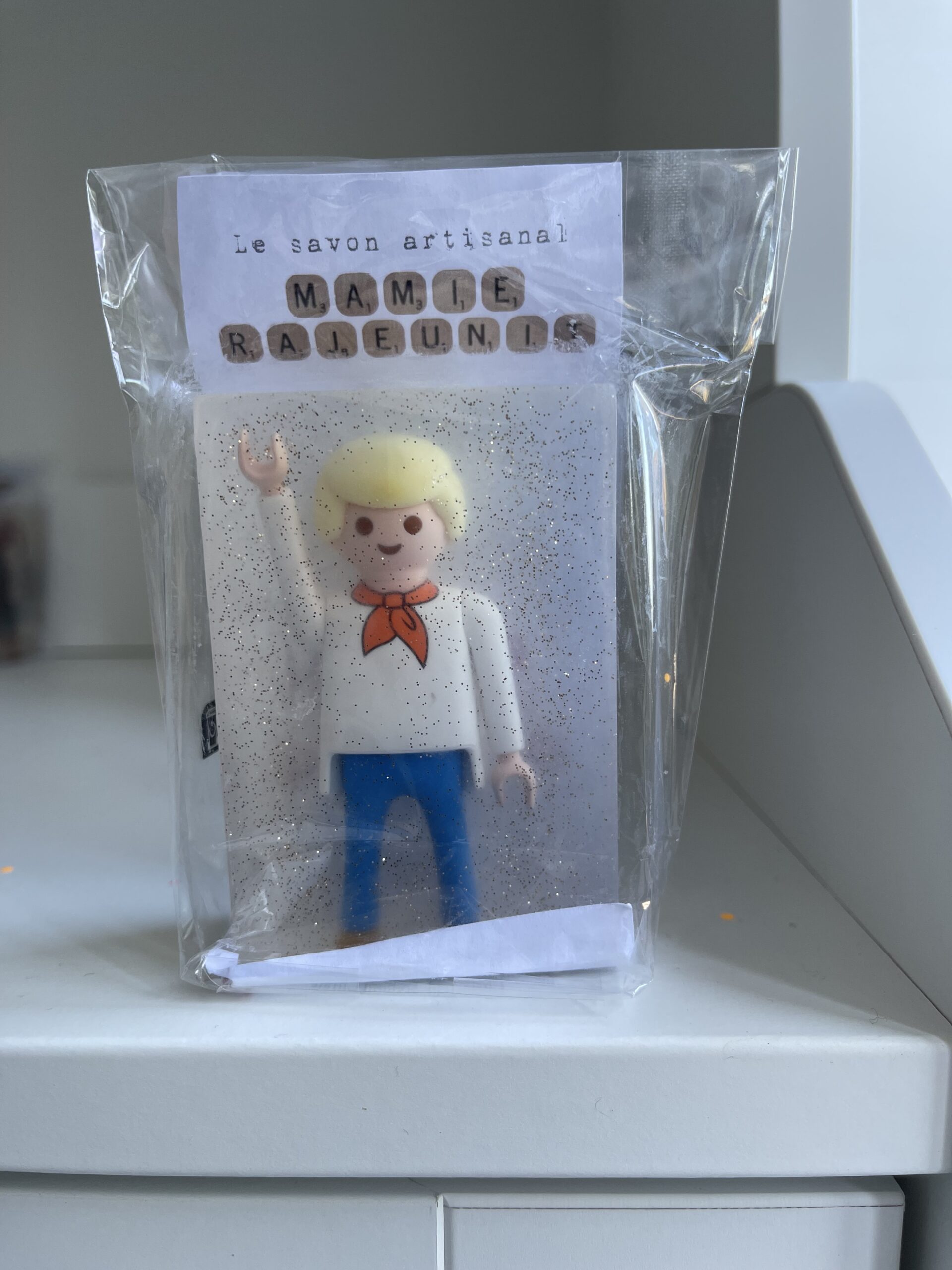En plus de votre figurine préférée, les savons de Mamie Rajeunit renferment aussi quelques paillettes (qui ne collent pas aux doigts) ainsi qu’une délicate et délicieuse odeur de talc.